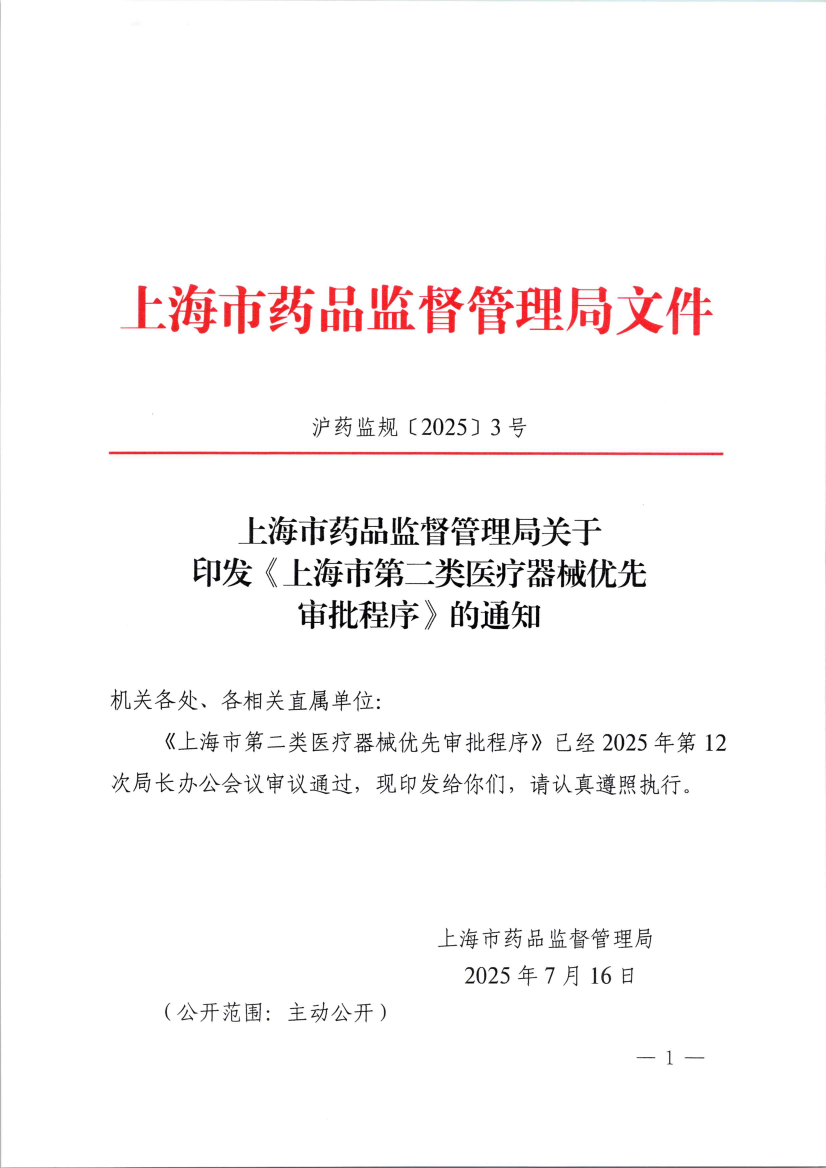 《上海市第二类医疗器械优先审批程序》已经2025年第12次局长办公会议审议通过,现印发给你们,请认真遵照执行。