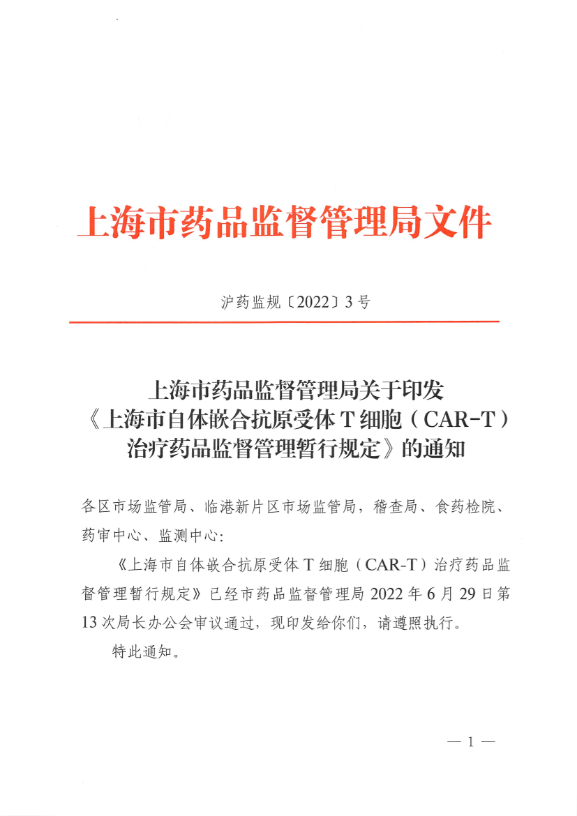 上海市自体嵌合抗原受体T细胞(CAR-T)治疗药品监督管理暂行规定