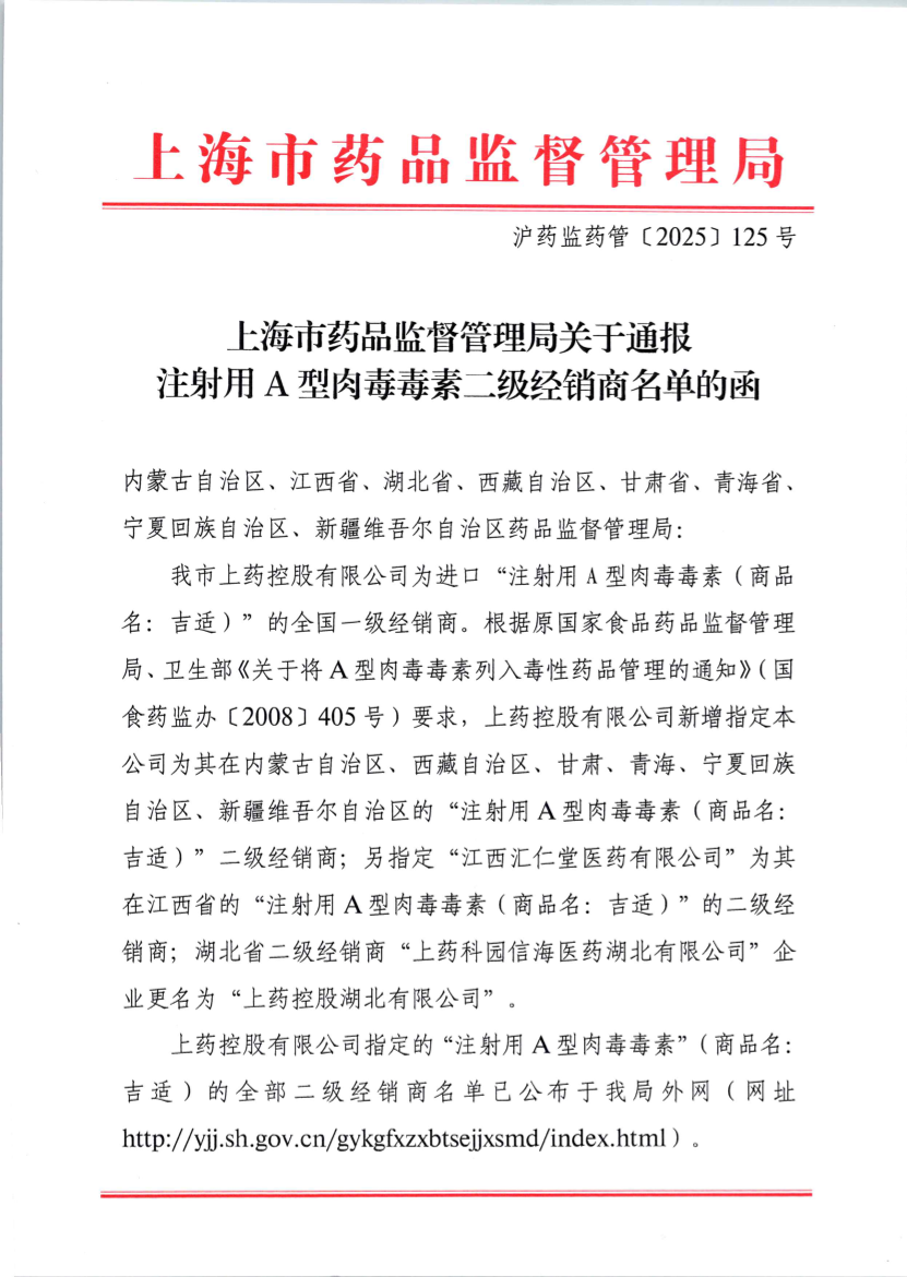 我市上药控股有限公司为进口“注射用A型肉毒毒素(商品名:吉适)”的全国一级经销商。根据原国家食品药品监督管理局、卫生部《关于将A型肉毒毒素列入毒性药品管理的通知》(国食药监办〔2008〕405号)要求,上药控股有限公司新增指定本公司为其在内蒙古自治区、西藏自治区、甘肃、青海、宁夏回族自治区、新疆维吾尔自治区的“注射用A型肉毒毒素(商品名:吉适)”二级经销商;另指定“江西汇仁堂医药有限公司”为其在江西省的“注射用A型肉毒毒素(商品名:吉适)”的二级经销商;湖北省二级经销商“上药科园信海医药湖北有限公司”企业更名为“上药控股湖北有限公司”。