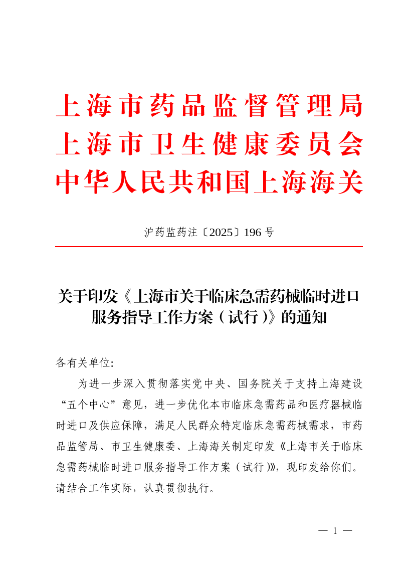 上海市关于临床急需药械临时进口服务指导工作方案(试行)