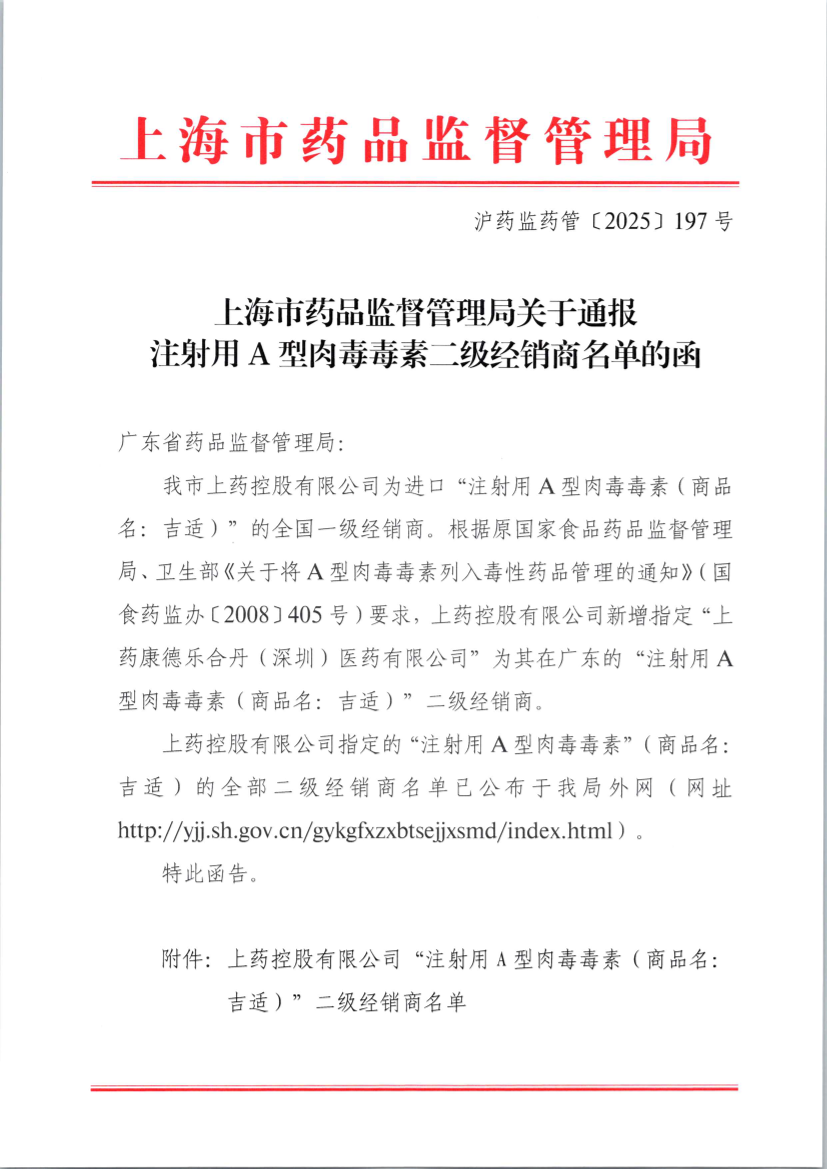 我市上药控股有限公司为进口“注射用A型肉毒毒素(商品名:吉适)”的全国一级经销商。根据原国家食品药品监督管理局、卫生部《关于将A型肉毒毒素列入毒性药品管理的通知》(国食药监办〔2008〕405号)要求,上药控股有限公司新增指定“上药康德乐合丹(深圳)医药有限公司”为其在广东的“注射用A型肉毒毒素(商品名:吉适)”二级经销商。
