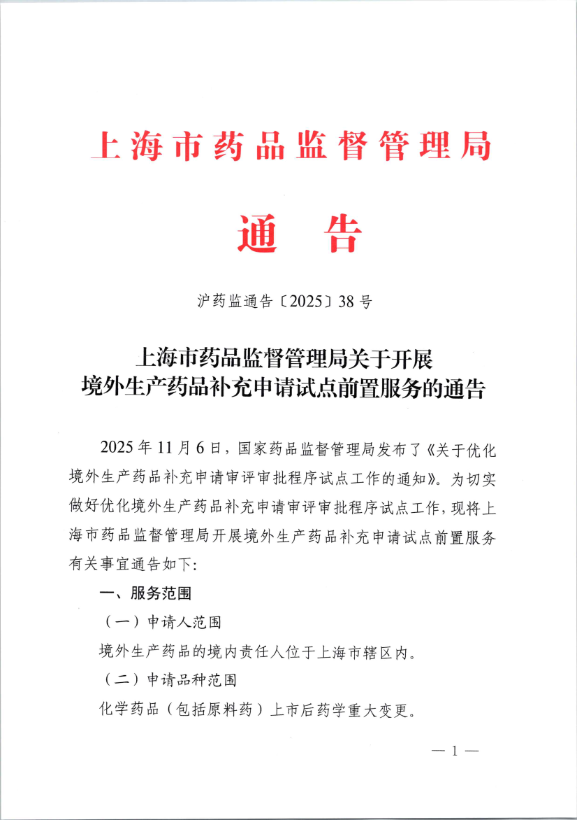 2025年11月6日,国家药品监督管理局发布了《关于优化境外生产药品补充申请审评审批程序试点工作的通知》。为切实做好优化境外生产药品补充申请审评审批程序试点工作,现将AG真人开展境外生产药品补充申请试点前置服务有关事宜通告如下: