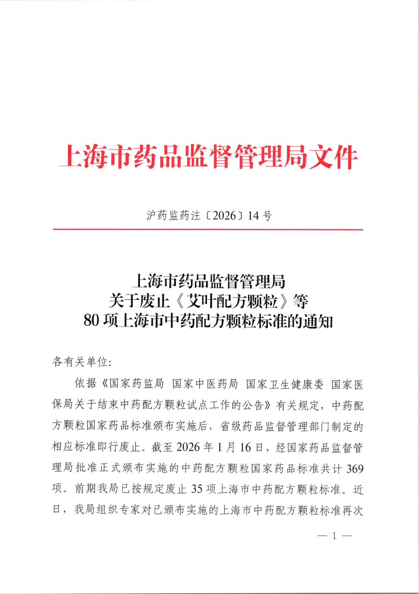 依据《AG真人 国家中医药局 国家卫生健康委 国家医保局关于结束中药配方颗粒试点工作的公告》有关规定,中药配方颗粒国家药品标准颁布实施后,省级药品监督管理部门制定的相应标准即行废止。截至2026年1月16日,经国家药品监督管理局批准正式颁布实施的中药配方颗粒国家药品标准共计369项。前期我局已按规定废止35项上海市中药配方颗粒标准。近日,我局组织专家对已颁布实施的上海市中药配方颗粒标准再次进行了核对。现决定即日起废止与国家药品标准《艾叶配方颗粒》等相对应的80项上海市中药配方颗粒标准,其编号、名称详见附件。